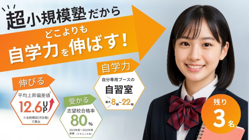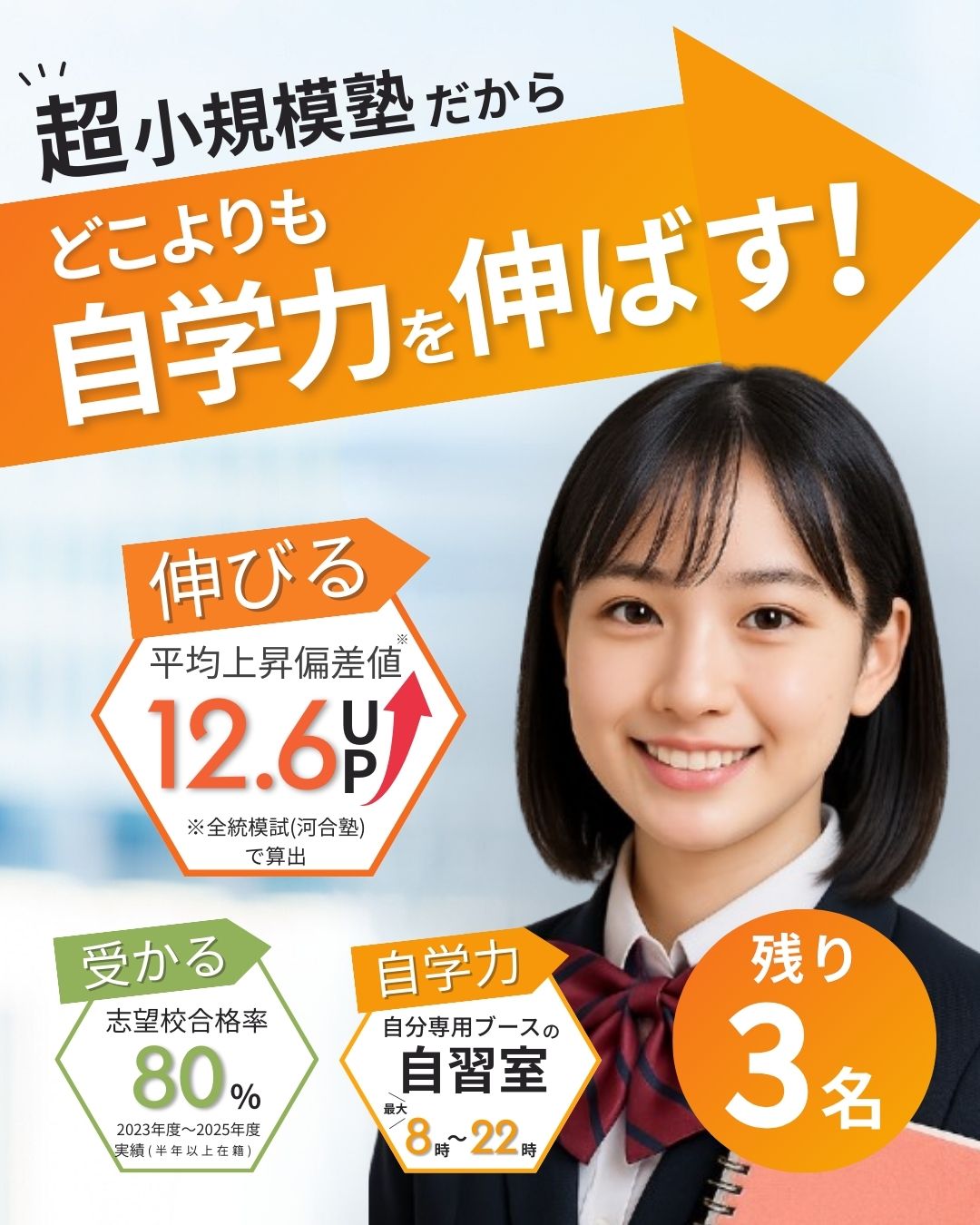 静かで集中できる「自分だけの空間」で学習成果を独り占め!周りを気にせず、あなたのペースで着実に学習成果を上げられます。超小規模塾だからこそ実現できる「きめ細かな学習マネジメント」を行っております。圧倒的な学習成果だけではなく、志望校の先までナビゲートします。