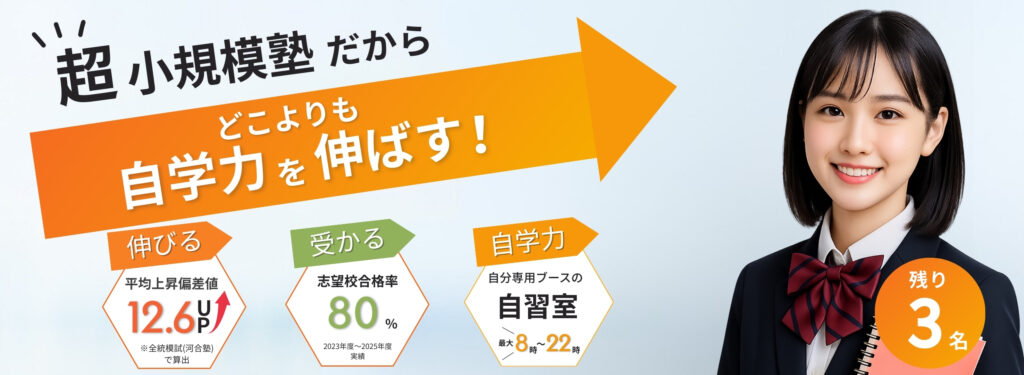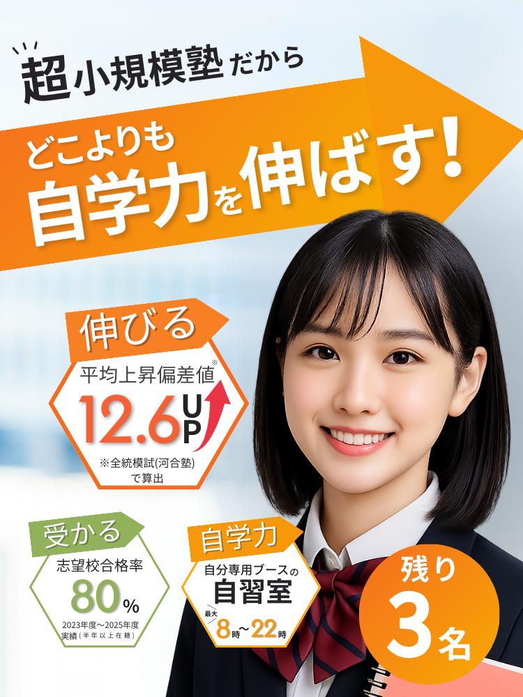 数多くの学習塾・予備校がある中で、当塾のウェブサイトをご覧いただき、ありがとうございます。今の学力(偏差値)に不安を感じ、受験の挑戦を諦めたりしていませんか?
