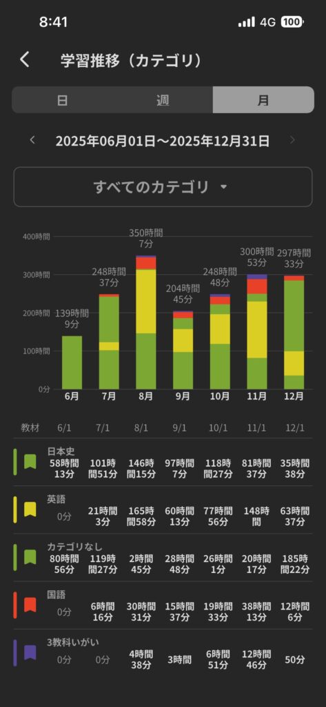 ☑学習時間鬼管理は一番下の画像(夏は600時間到達!)